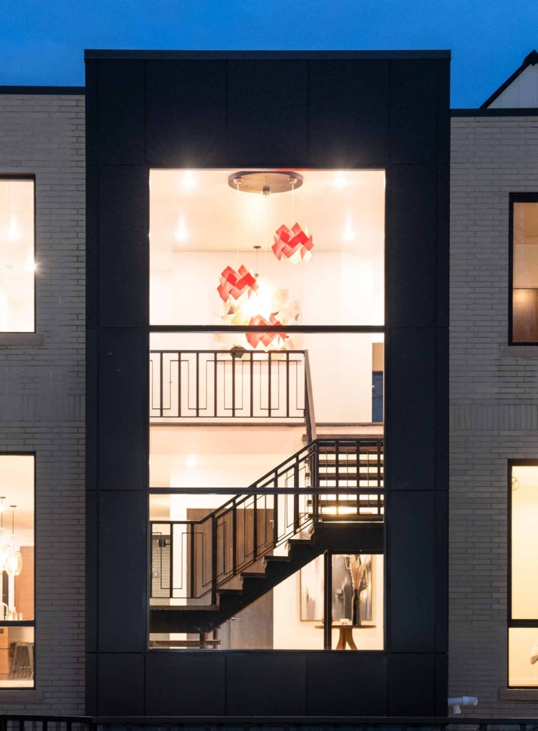 Floor-to-ceiling windows flood the interiors with natural light, creating an airy, open atmosphere throughout. Fireplaces are wrapped in large-format porcelain tile bringing dramatic elegance and refinement. Hand-selected premium materials cover every surface, blending the warmth of organic textures with clean lines of modern design. A custom-designed metal staircase and railing system is featured as an eye-catching focal point.